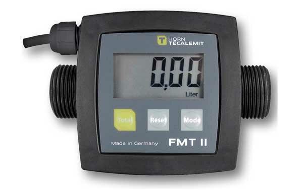Débitmètre électronique FMT II pour adaptation sur pompe à carburant. Entrée produit : En Bas et Sortie produit : En HautLe FMT II est un débitmètre pour les écoulements de liquides qui fonctionne selon le principe de mesure d’un compteur à roue de turbine.